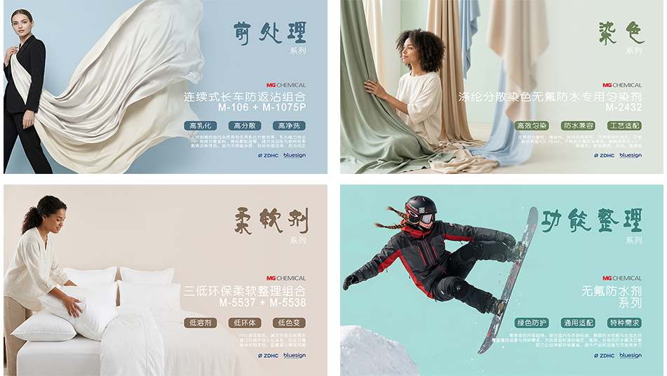 在展馆一层H2-C361展位,美高化工此次展会不仅重点展示了其“通用型”与“特种型”无氟防水剂完整产品线,还系统呈现了在前处理、染色、柔软整理系列的创新成果: