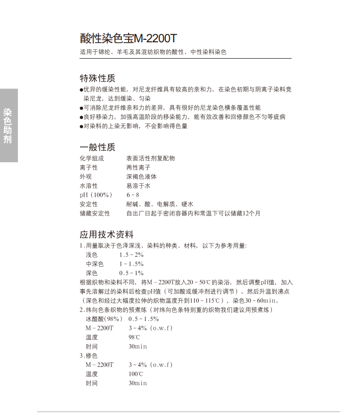 适用于锦纶、羊毛及其混纺织物的酸性、中性染料染色。