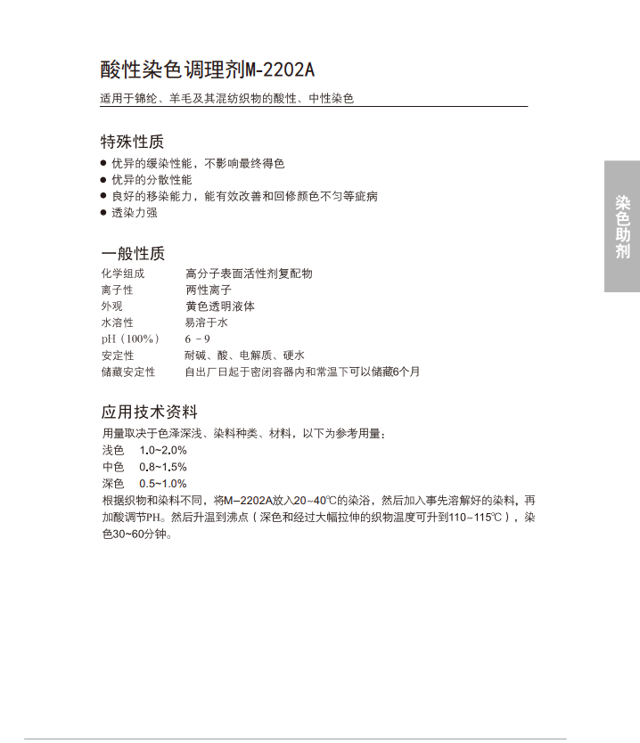 适用于锦纶、羊毛及其混纺织物的酸性、中性染色。