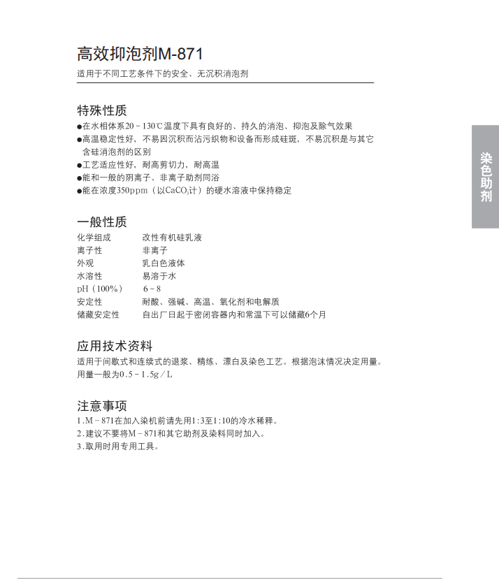 具有良好的、持久的消泡、 抑泡及除气效果;高温稳定性好,工艺适应性好。