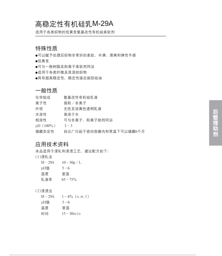 可赋予织物柔软、滑爽 手感,使用稳定性极佳,可与一般树脂及阳离子柔软剂同浴使用。
