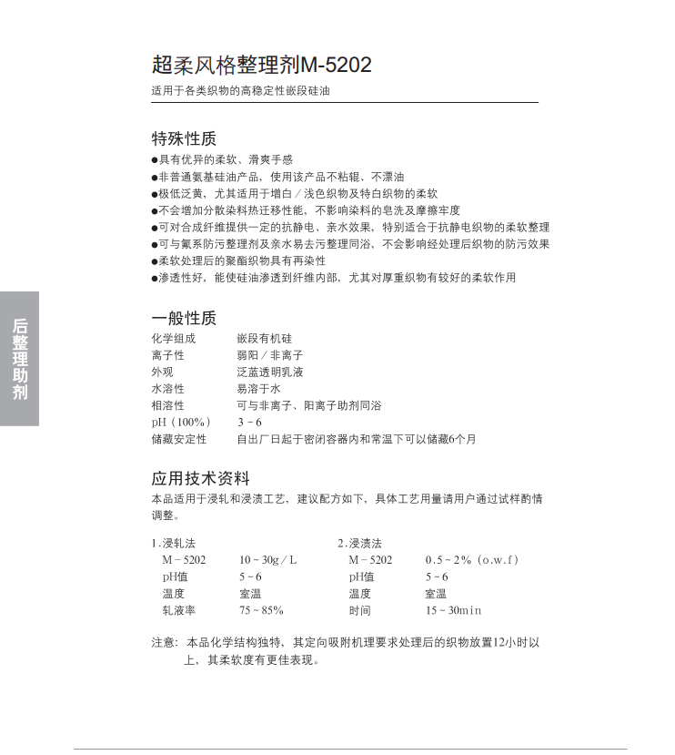 用于各类型纤维织物的高稳定性嵌段硅油,具有优异的柔软、滑爽手感, 使用稳定性极佳,可直接回修免于剥硅烦恼。不会增加分散染料的热迁移 性能,不影响染料的皂洗及摩擦牢度。常规浸轧用量:10-30g/L