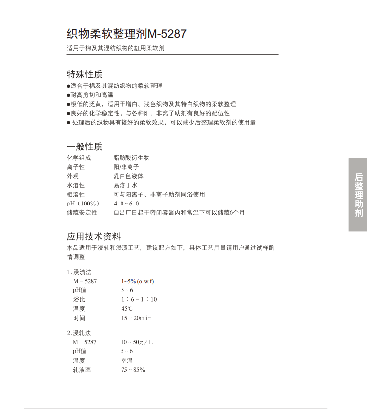 用于棉及其混纺织物的柔软整理。耐高剪切和高温,黄度极低,适用于增白、浅色和超白织物的软整理。