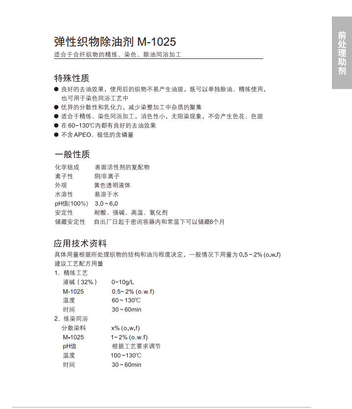 优异的分散性和乳化力, 减少染整加工中杂质的聚集,消色性小,无阻染现象,不易产生色花、色斑。