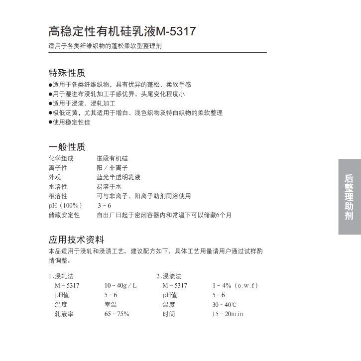 适用于纤维素纤维及其混纺织物的蓬松、柔软、滑爽型嵌段有机硅柔软剂。