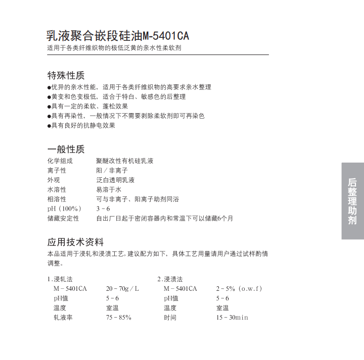 手感柔软、蓬松,黄变、色变 极低,稳定性好,不易破乳漂油,具有亲水抗静电效果,经整理织物可直 接回修,免除剥硅烦恼。