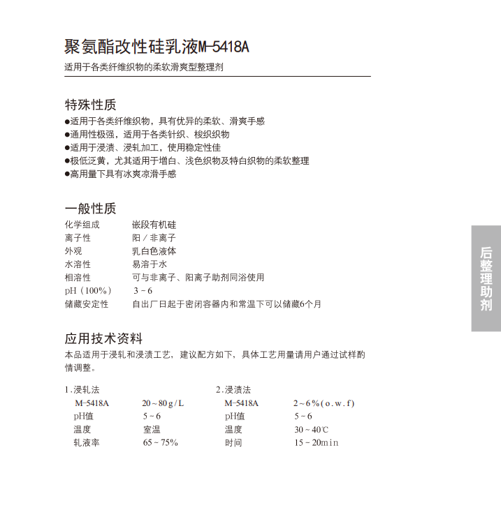 具有优异的软滑滋润手感,细腻度提升性好,高用量下可做凉滑整理剂使用。使用稳定性好,黄变、色变极低。经充分回潮织物的手感滑度下降不明显。