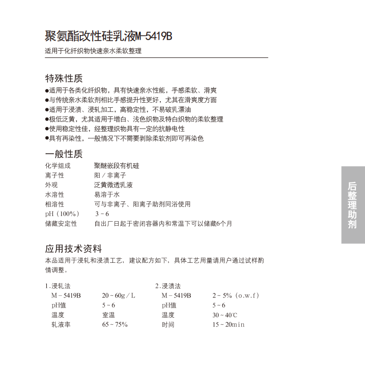 手感柔软、滑爽,黄变、色变 极低,稳定性好,不易破乳漂油,具有亲水抗静电效果,经整理织物可直接回修,免除剥硅烦恼。