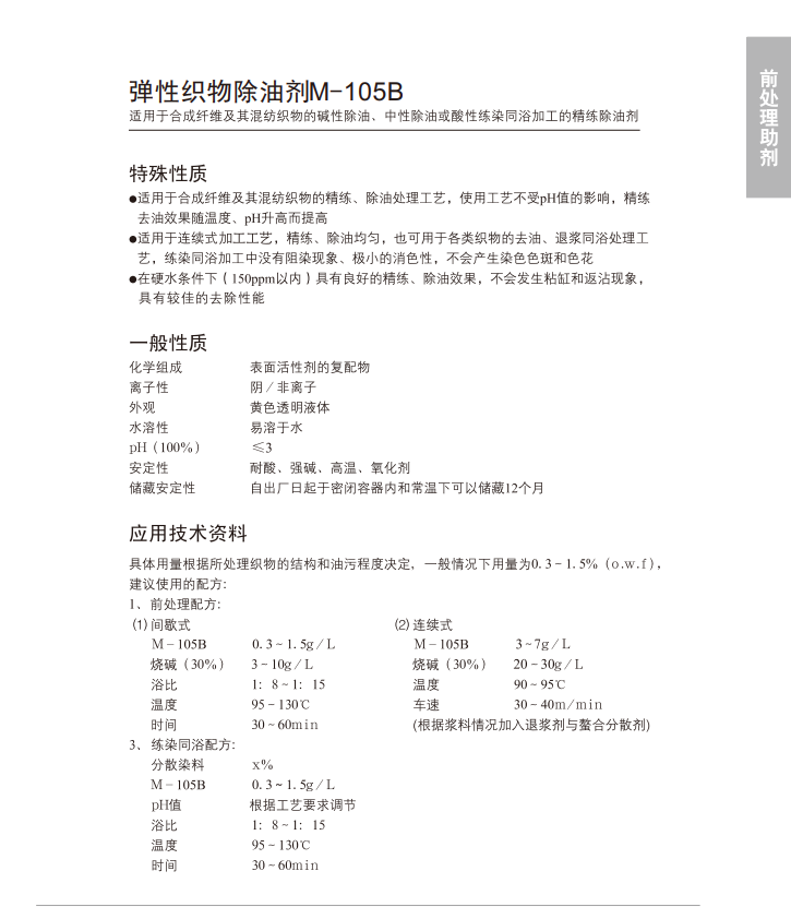 工艺用量:间歇式0.3-1.5%(o.w.f),连续式3-7g/L,练染同浴:0.3-1.5 g/L