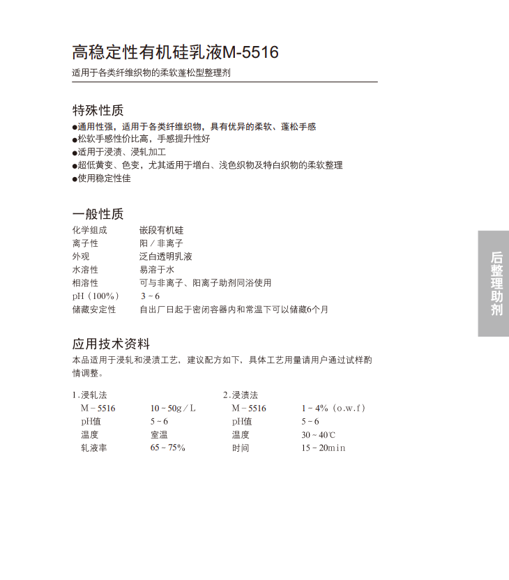 通用性强,适用于各类纤维织物,具有优异的柔软、蓬松手感;适用于浸渍、浸轧加工。超低黄变、色变,尤其适用增白、浅色织物;使用稳定性佳。