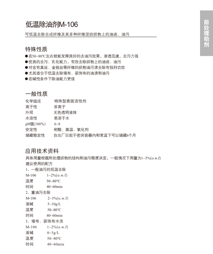50~80℃就能发挥良好的去油污效果,渗透迅速,去污力强。适用于含真丝、金银丝等纤维的织物,墙布、装饰布等织物的油渍去除。碱性条件下除油更佳。