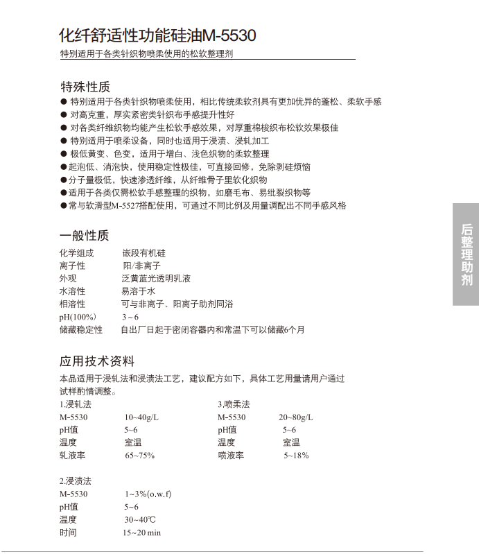 特别适用于喷柔设备,同时也适用于浸渍、浸轧加工。极低黄变、色变,适用于增白、浅色织物。对高克重厚重织物手感提升好。
