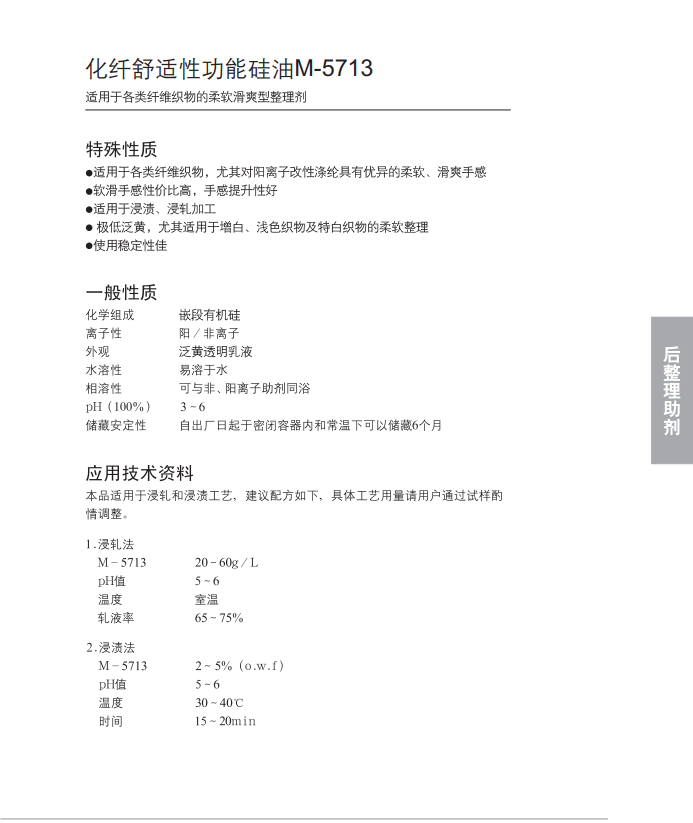 具有优异的柔软、滑爽手感, 可与蓬松类硅油配合使用,调配出不同的手感风格。黄变、色变极低,使用稳定性好,经整理织物可直接回修,免除剥硅烦恼。