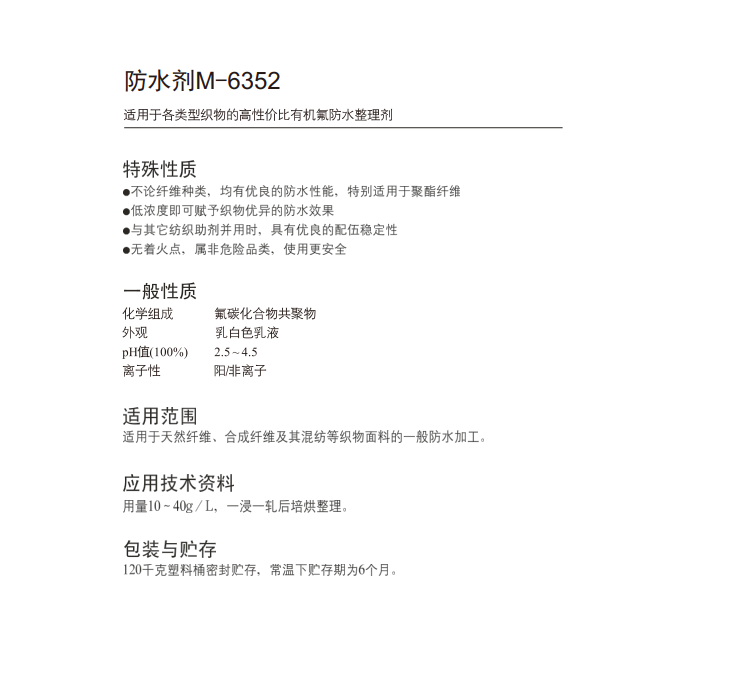 低浓度即可赋予织物优良的防水性能,与其他纺织助剂有优良的配伍稳定性。无着火点,非危险品。