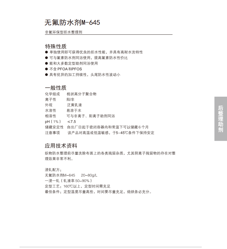 高耐水洗,与氟素防水剂同浴使用可提高氟素防水性价比。能和大多柔软剂同浴使用。优异的加工可持续性。不含PFOA和PFOS。