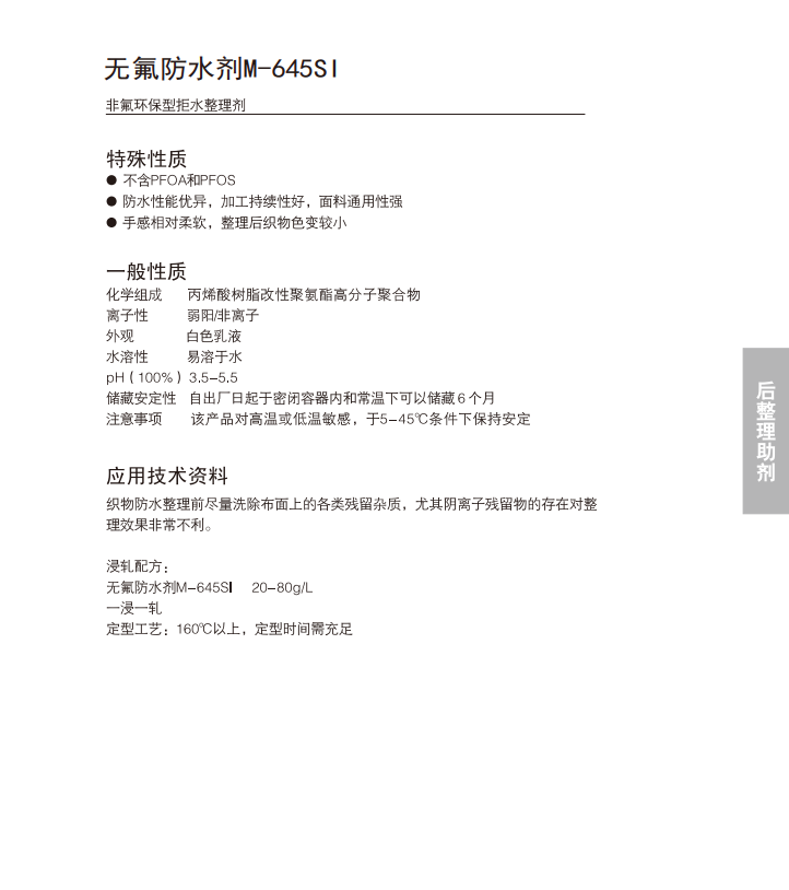 防水性能优异,加工持续性好,面料通用性强。手感相对柔软,整理后织物色变较小。不含PFOA和PFOS。