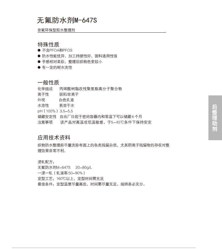 防水性能优异,加工持续性好,面料通用性强。手感相对柔软,整理后织物色变较小。有一定耐水洗性。不含PFOA和PFOS。