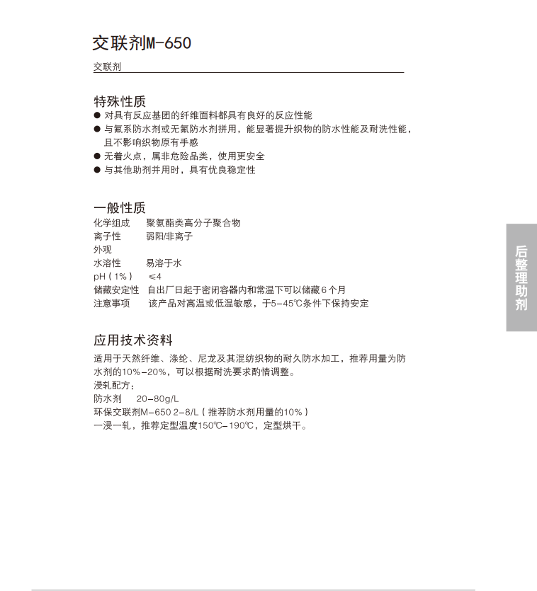 对具有反应基团的纤维素面料都具有良好的反应性能。与氟系或无氟防水剂拼用能显著提升织物的防水性能及耐洗性能。