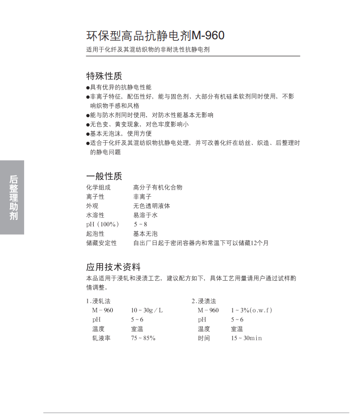 适用于化纤及其混纺织物的非耐洗性抗静电剂。