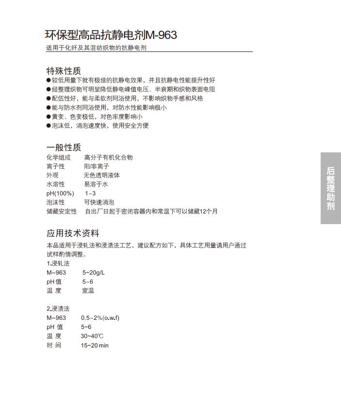 较低用量下就有极佳抗静电效果。配伍性好,能与柔软剂/防水剂同浴使用。黄变、色变极低;泡沫低,消泡速度快。