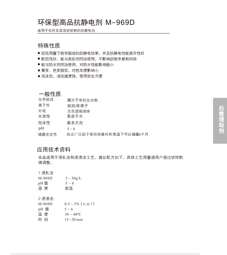 较低用量下就有极佳抗静电效果。配伍性好,能与柔软剂/防水剂同浴使用。黄变、色变极低;泡沫低,消泡速度快。
