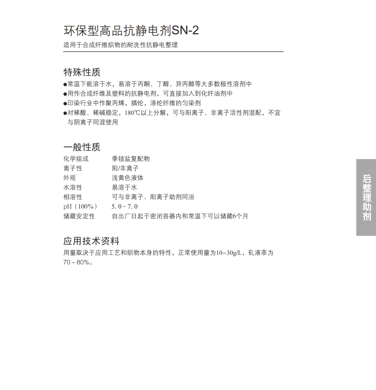 阳离子特性,抗静电效果提升性好,控制适当用量,关注对色变和色牢度的影响。