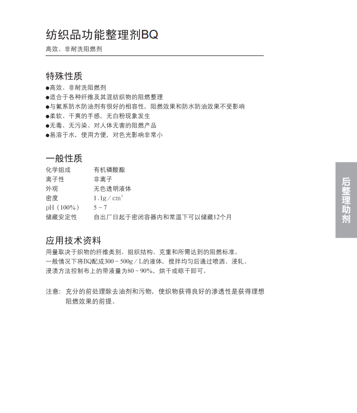 干爽不发粘,不影响手感风格, 无白粉现象,对色光影响非常小。是无毒、无污染,对人体无害的阻燃产品。