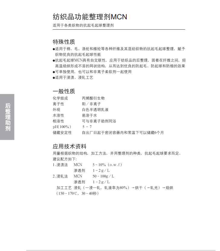赋予织物优良的抗起毛起球性能。产品具有自交联性,经整理固着在纤维之间,经高温焙烘形成不溶性网状结构,从而达到优良的抗起毛起球和防缩效果。