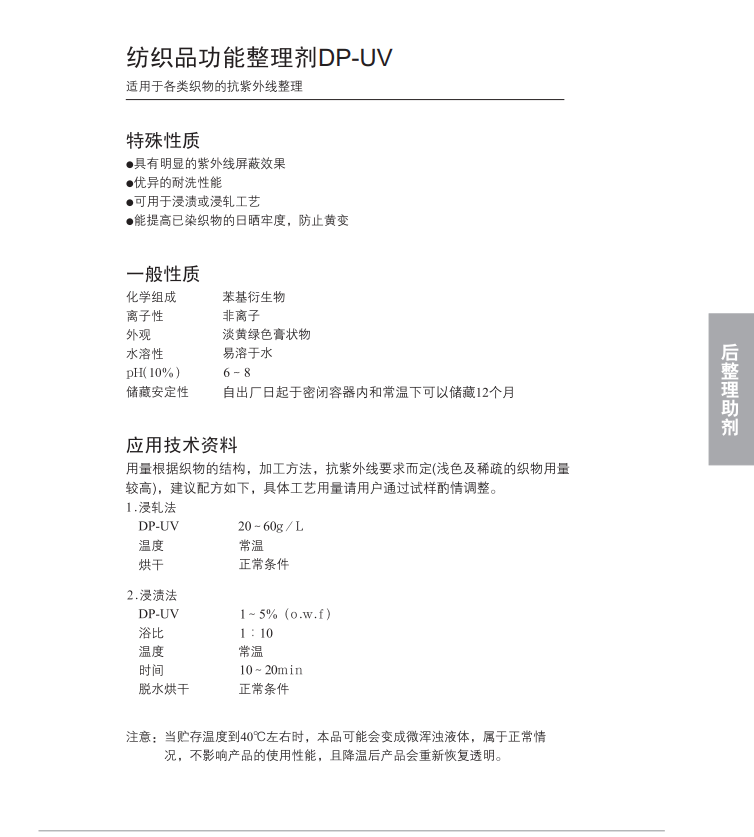 具有明显的紫外线屏蔽效果,优异的耐洗性,能提高已染织物的日晒牢度,防止色变。
