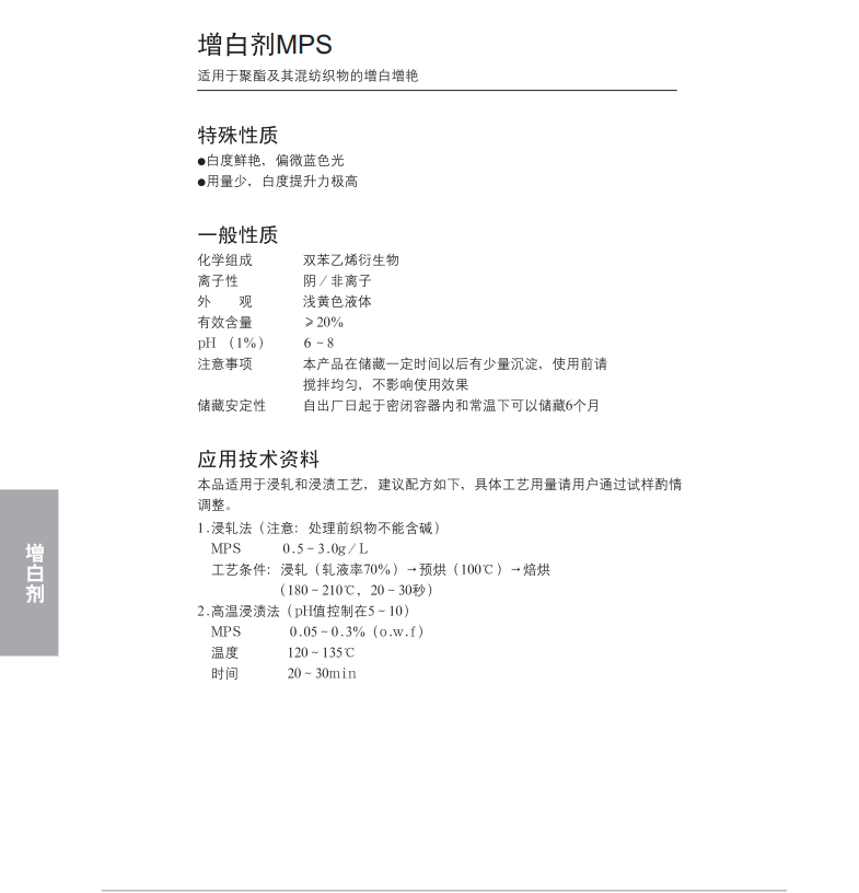 工艺用量:高温浸渍法0.05-0.3%(o.w.f),浸轧法0.5-3g/L