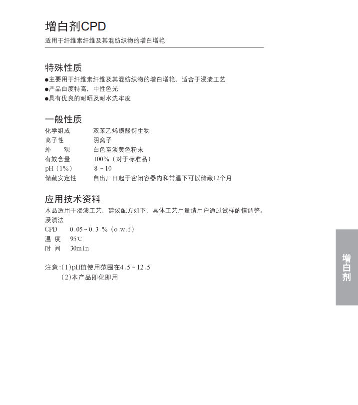 适用于纤维素纤维及其混纺织物的增白、增艳。