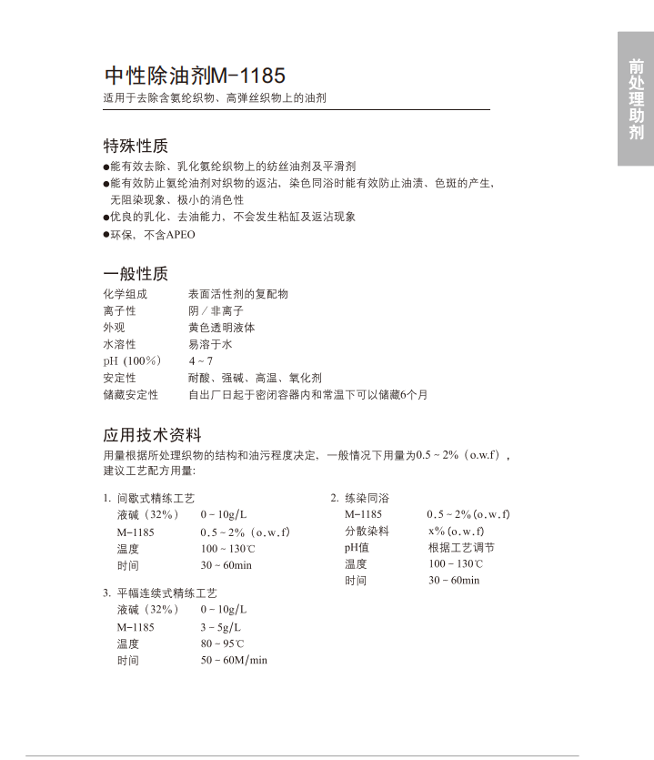 适用于去除含氨纶织物、高弹丝织物上的油剂。