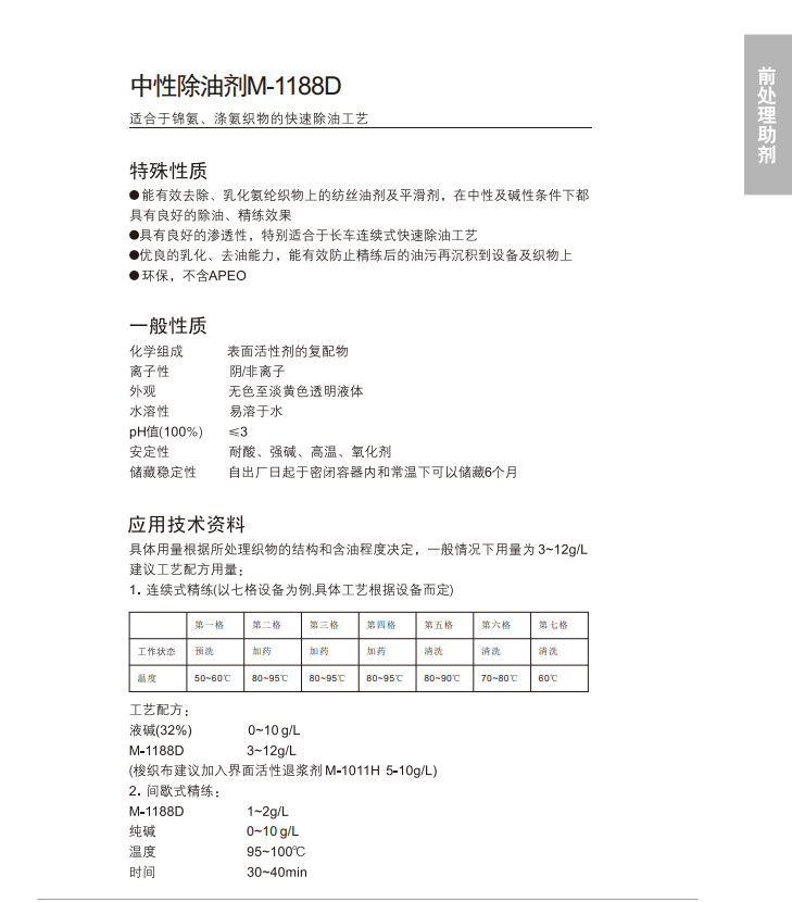 良好的渗透性,特别适合于长车连续式快速除油工艺,优良的乳化、去油能力,能有效防止精练后的油污 再沉积到设备及织物上。