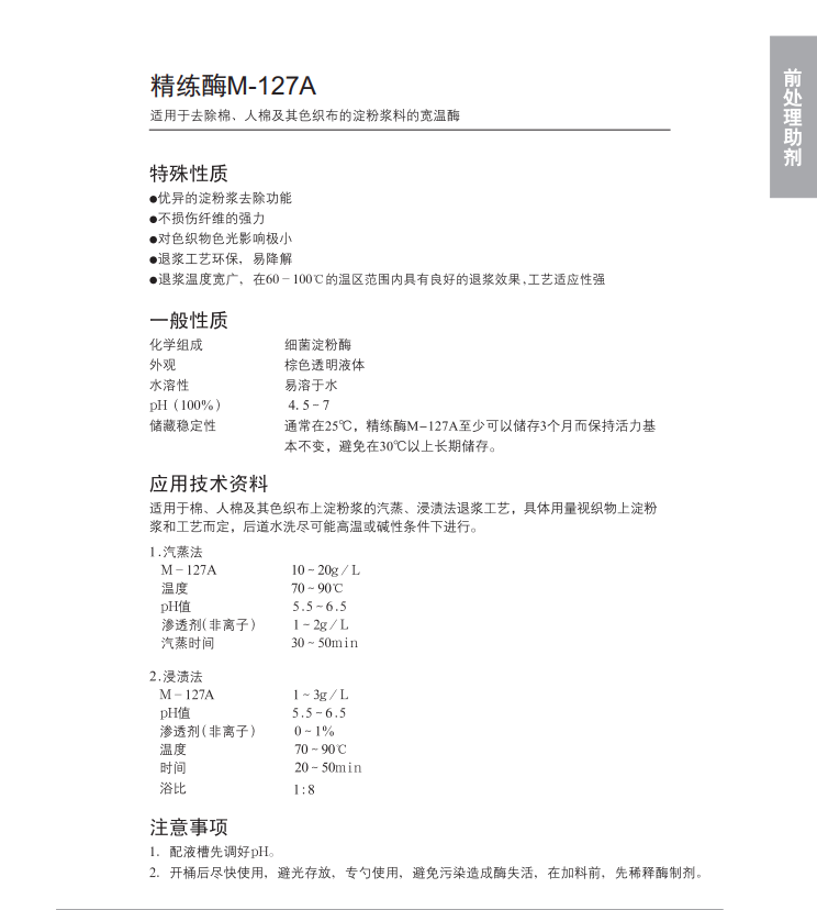退浆温度范围宽广:60-100℃,工艺适应性强,可用于汽蒸法、浸渍法工艺退浆,优异的淀粉去除功能,节能、 环保。