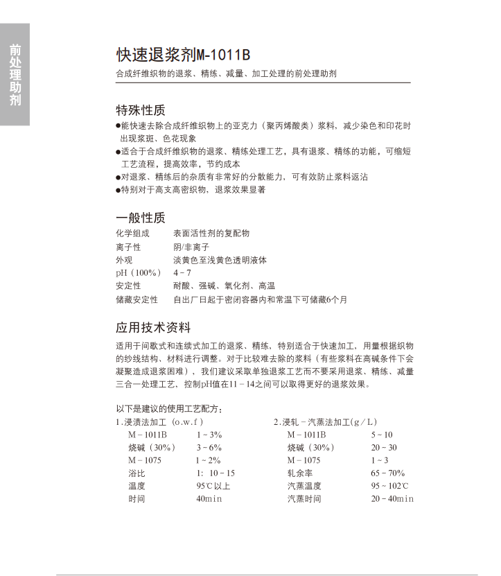 工艺用量:间歇式1-3%(o.w.f), 连续式5-10g/L