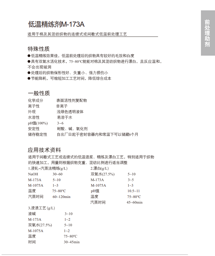 低温精练效果佳,处理后织物毛效、白度较好。具双氧水活化特性,75~80℃可漂白棉及其混纺织物,处理后织物保形性好、失重小、强力损伤小。
