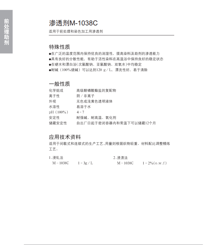 工艺用量:浸渍法1-2g/L,浸轧法1-3g/L