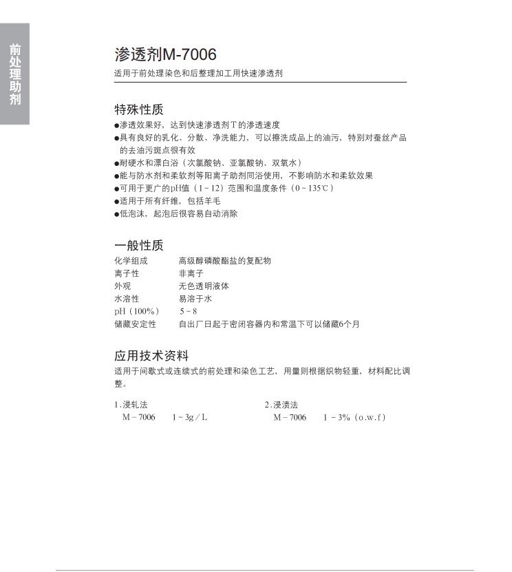适用范围广,渗透能力极佳、低泡,可与各种助剂同浴。