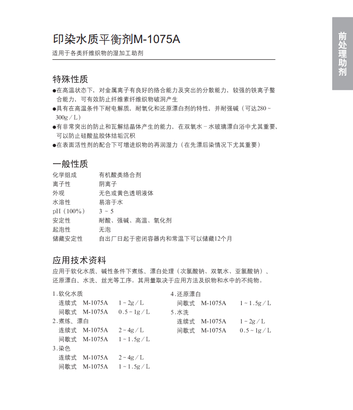各类纤维织物湿加工助剂,优异的螯合、分散、保护胶体功能。