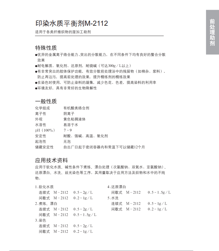 适用于织物退浆及各种织物前处理、增白、染色、印花等加工工艺。