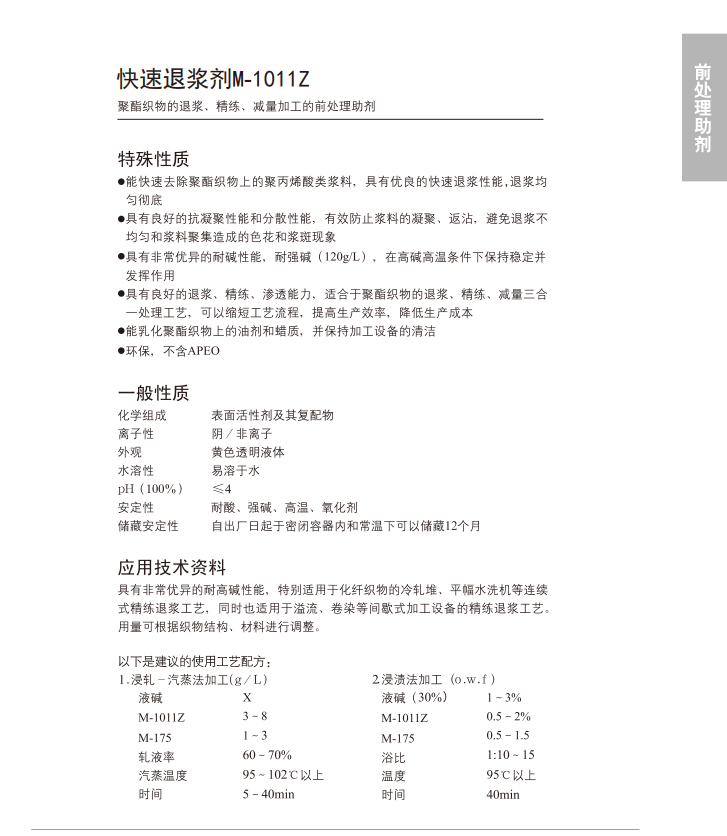 工艺用量:间歇式0.5-1.5%(o.w.f), 连续式3-8g/L