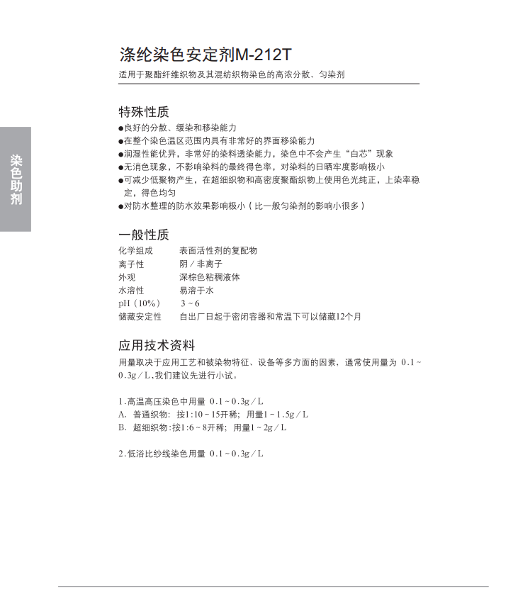 良好的缓染、 移染能力,分散性优异,消色性小,可减少齐聚物产生,可有效预防艳蓝、 翠蓝类聚集引起的色点色花。可1:6-10开稀使用,性价比高。