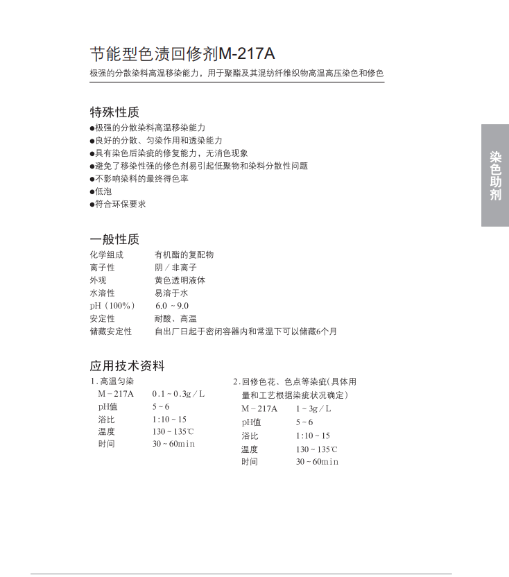 良好的缓染、分散性能,移染性能优异,消色性小;适用于高支高密及易花品种匀染和出现色花后的修复。