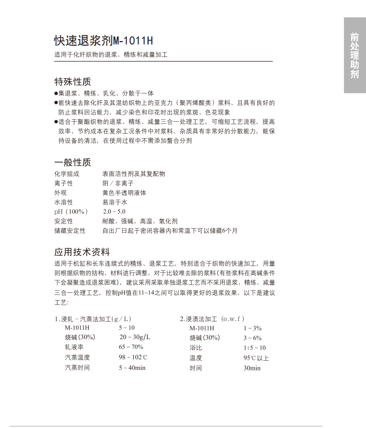 工艺用量:间歇式1-3%(o.w.f),连续式5-10g/L