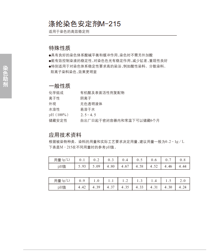 具有良好的染色体系酸碱平衡和缓冲作用,染色时不需另外加酸;可用于酸性、分散、阳离子染料染色,有利于染色色 光稳定,减少缸差,也有利于牢度提升。