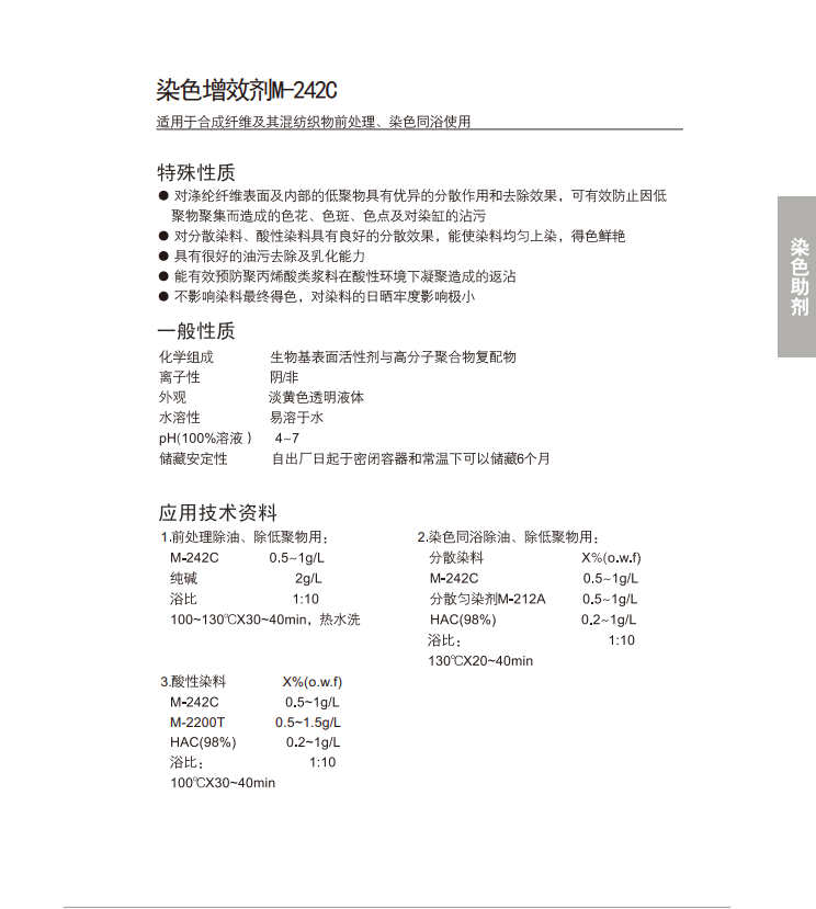 适用于合成纤维及其混纺织物前处理、染色同浴使用。