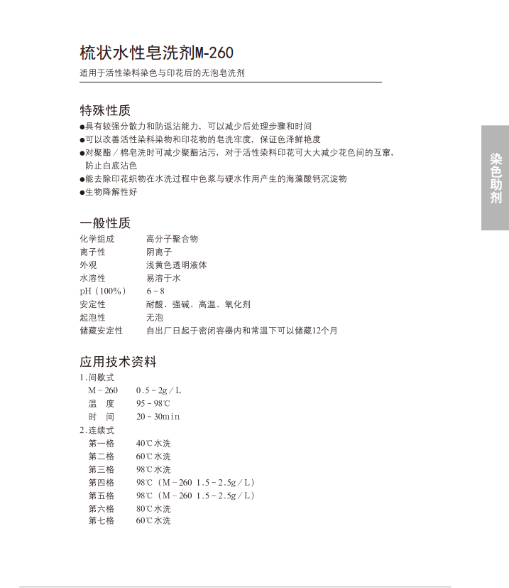 适用于活性染料染色与印花后的无泡皂洗剂。