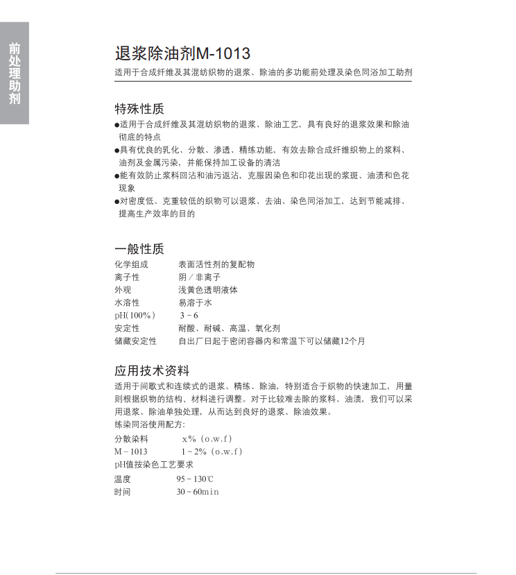 适用于合成纤维及其混纺织物的退浆、除油或染色退浆除油同浴加工工艺。