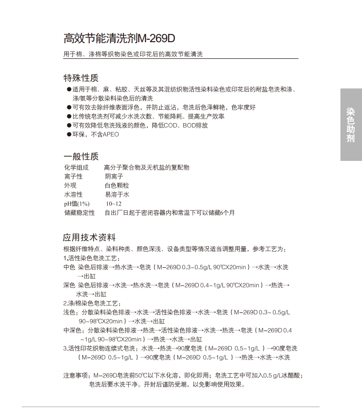 有效去除纤维表面浮色,防返沾,皂洗后色泽鲜艳,色牢度好。有效降低皂洗残液染料浓度,降低COD、BOD排放;不含APEO。