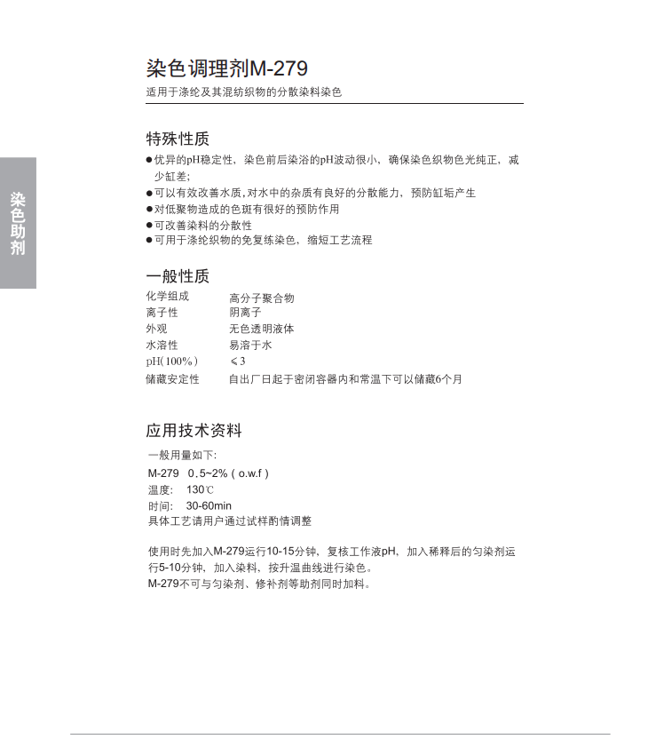 优异的pH稳定性,可有效改善水质,对水中的杂质有良好的分散能力,可预防缸垢;可改善染料分散性。可用于涤纶织物的免复练短流程染色工艺。
